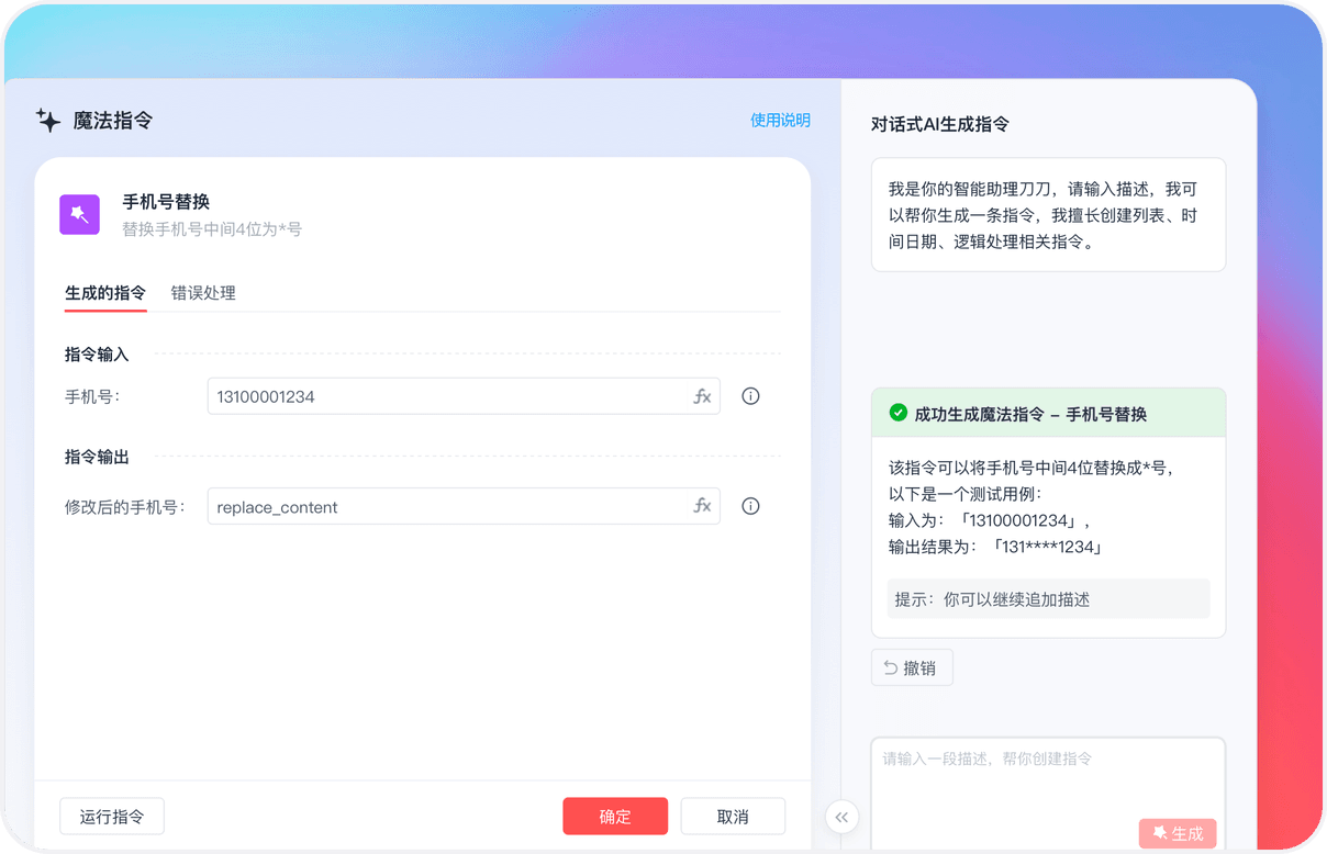通过对话智能生成魔法指令,解决包括数据处理、Excel、列表、图片、文本、文件、逻辑等类型的问题。你也可以通过追问的方式来修改已生成的魔法指令。影刀已为你准备了一系列的魔法指令模板,快去试试吧!
