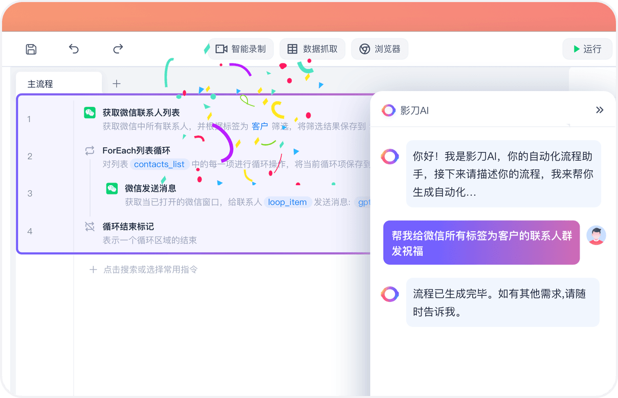 通过对话智能生成影刀自动化流程,会帮你自动选择需要的指令,自动填写指令参数,自动抓取屏幕的元素。从而帮助你更快速,更稳定地搭建影刀自动化应用,完成业务自动化的搭建。