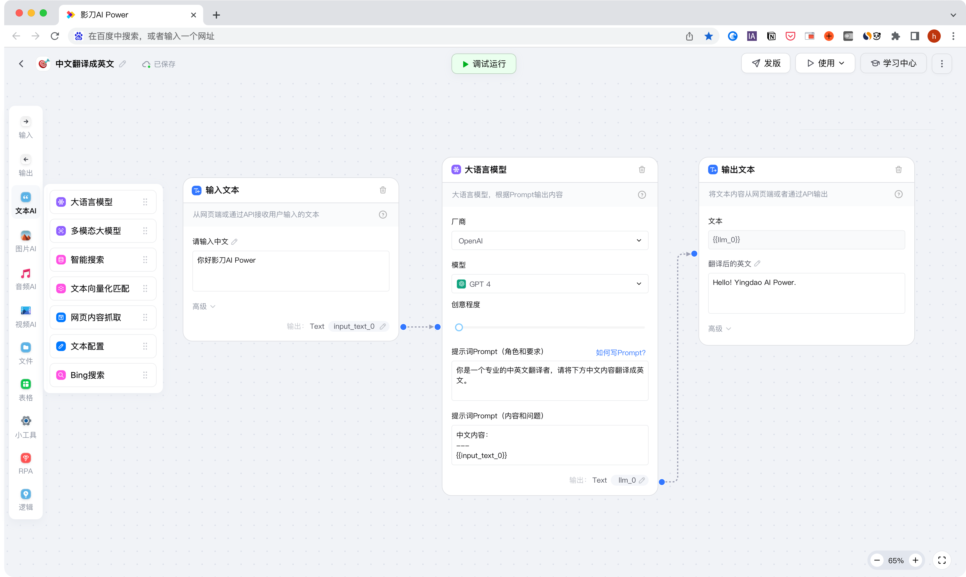 拖拽几个组件,连连线,简单配置即可搭建一个AI应用。