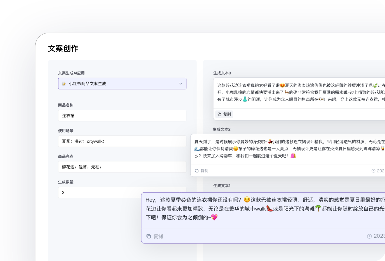 你的业务需求,即可生成多段符合业务需求的高质量文案。