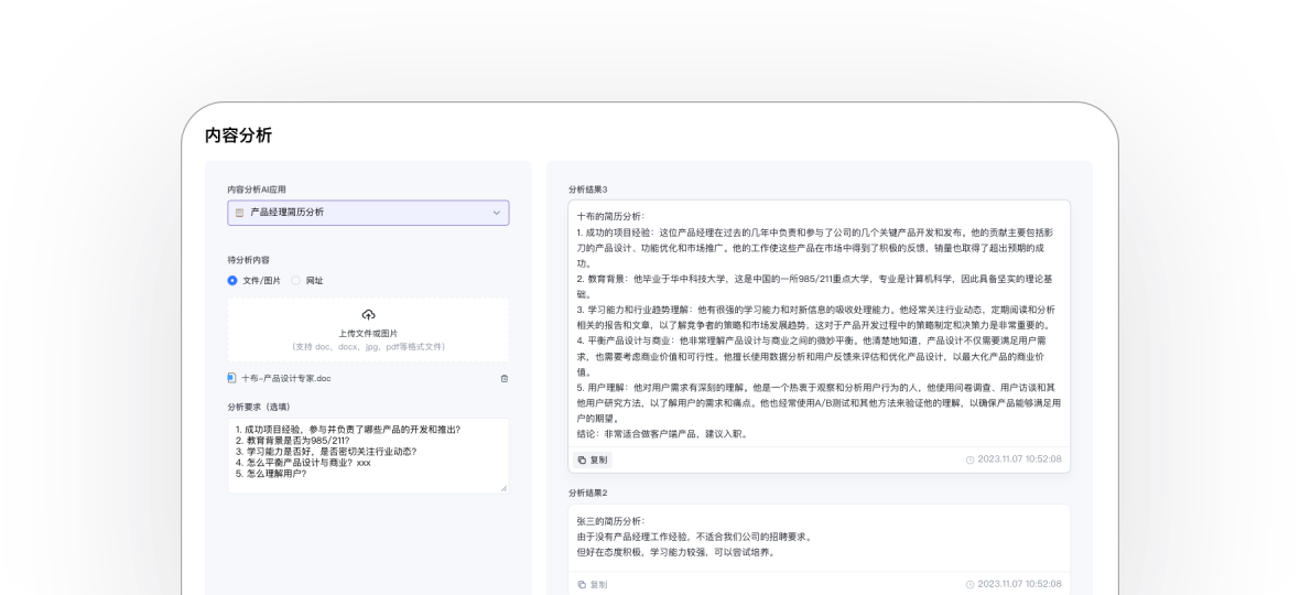 使用内容分析业务工具来分析你的文件、文本、网址、音频等内容,仅需简单配置需求,即可将生成分析结果。